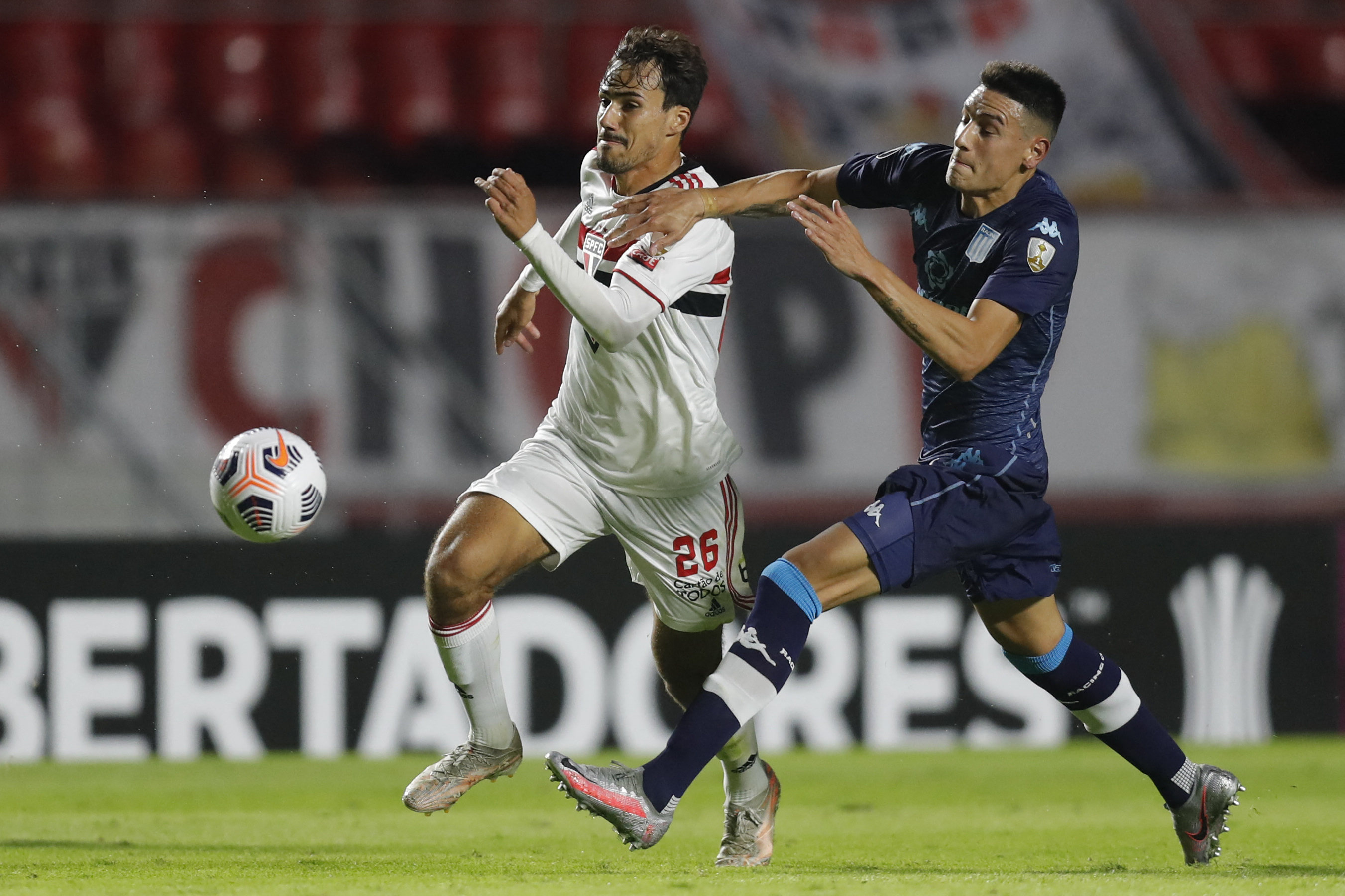 Vida dura do Tricolor na primeira etapa. Racing, com reservas também, conseguiu equilibrar as ações e, em jogadas rápidas pelas alas, levou muito perigo à meta adversária. O São Paulo mostrou muita correria em campo e pouca efetividade.
