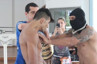 Maurício Facção e Rogério Paraíba travaram longos anos de provocação por conta do título do Wocs. Após baterem 65,2kg e 65,8kg, respectivamente, eles se encararam de maneira efusiva na pesagem. Dono do cinturão, Facção aproveitou o momento para empurrar o desafiante, que não gostou e foi para cima do mineiro.