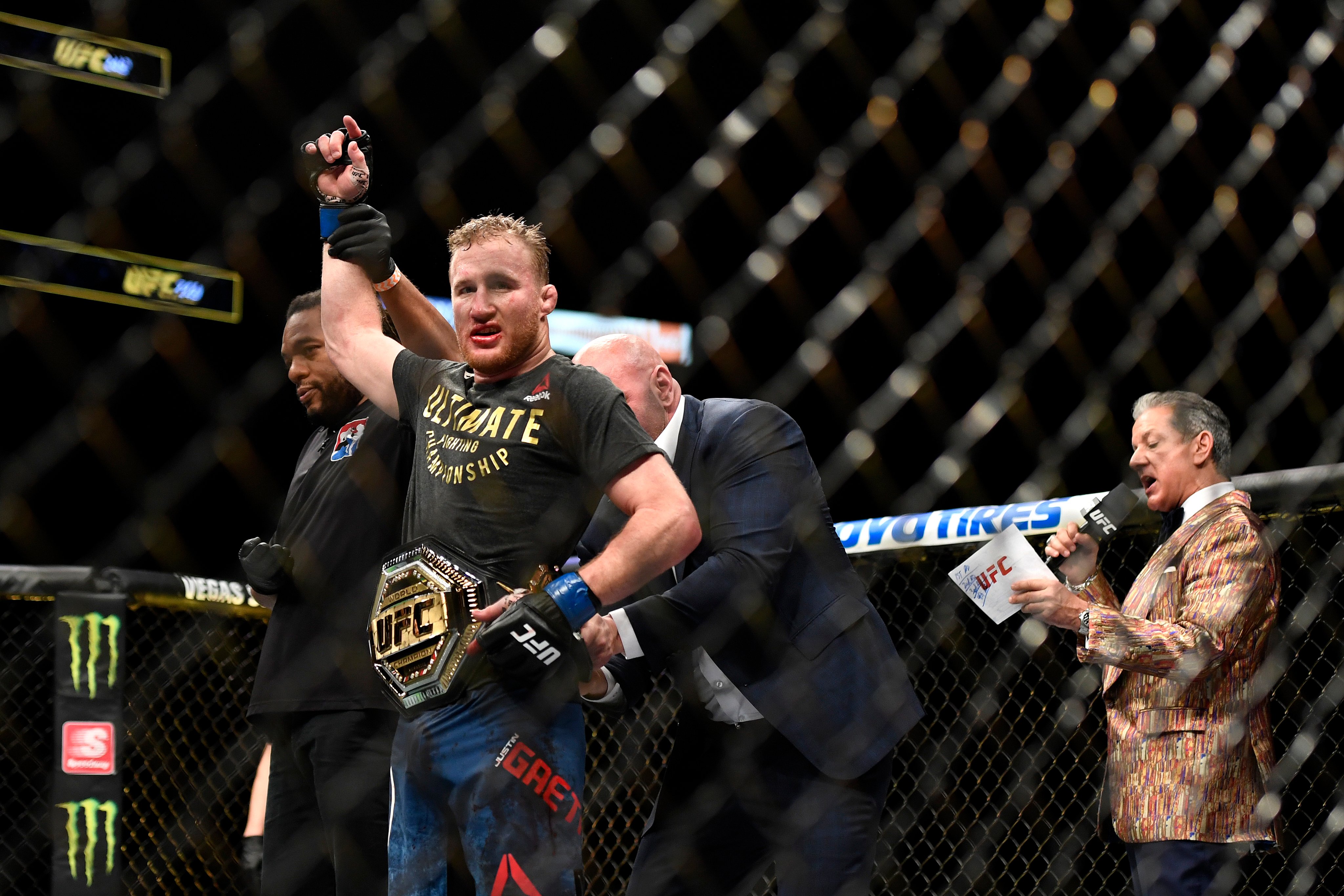 Tony conseguiu balançar Gaethje com um upper porém o ex-campeão do WSOF não se abalou e manteve o ritmo, chegando a levar perigo a Ferguson em diversas oportunidades até conseguir o nocaute técnico no quinto round, se tornando o novo campeão interino, posto que era ocupado por Tony até então.