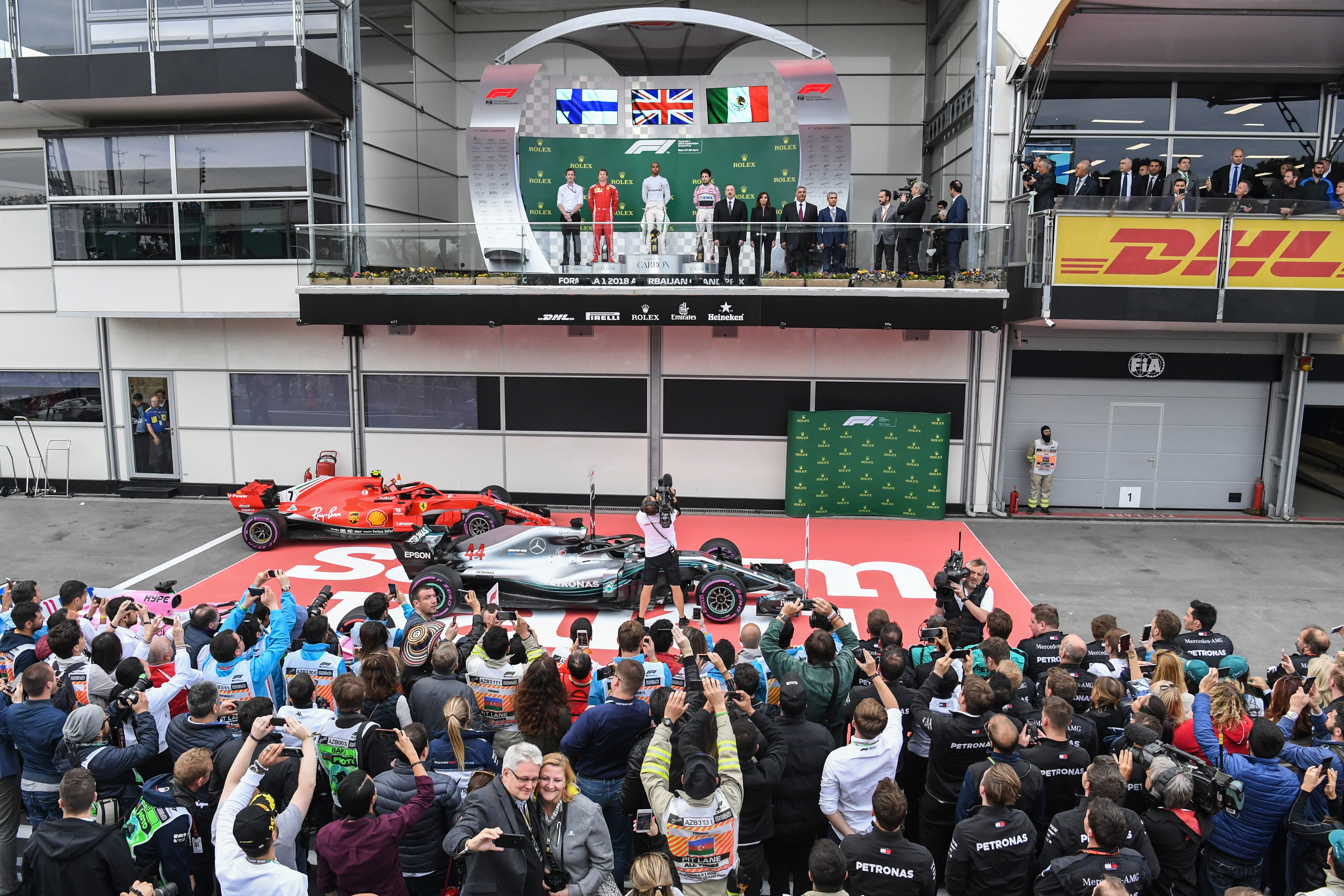 A Red Bull tinha chance de subir ao pódio. Com Ricciardo e Verstappen fora, a briga ficou entre as Ferrari e as Mercedes. Valtteri Bottas trocou o pneu no segundo safety car e, com isso, acabou ganhando a primeira posição que pertencia a Sebastian Vettel, com folga, desde o início da corrida. Na relargada, o erro capital de Sebastian Vettel: foi para o tudo ou nada contra Bottas. Os pneus frios não seguraram e ele perdeu posições, derrapando na curva. Logo depois, com a pista cheia de detritos, Bottas teve um pneu estourado e abandonou quando preparava-se para vencer e, se fosse o caso, sairia do Azerbaijão como líder do Mundial. Lewis Hamilton, Kimi Raikkönen (aproveitando-se de todas as quebras e acidentes) e Sergio Perez subiram ao pódio.